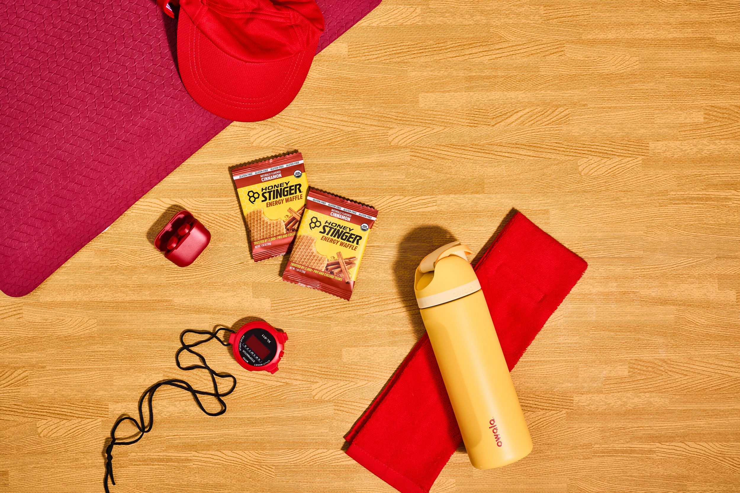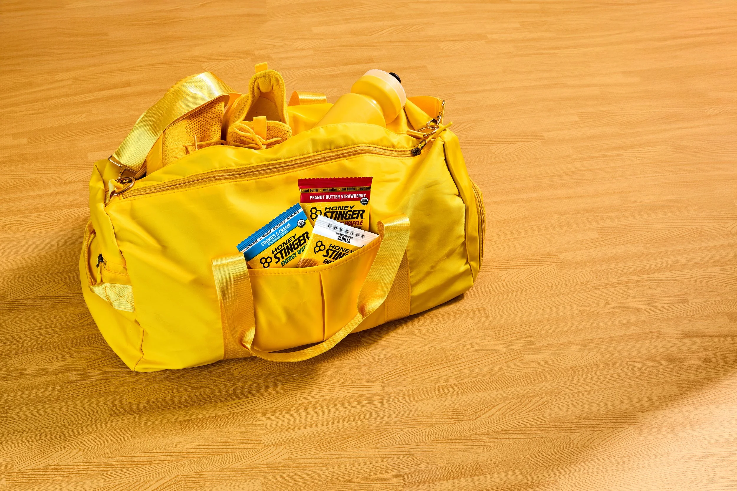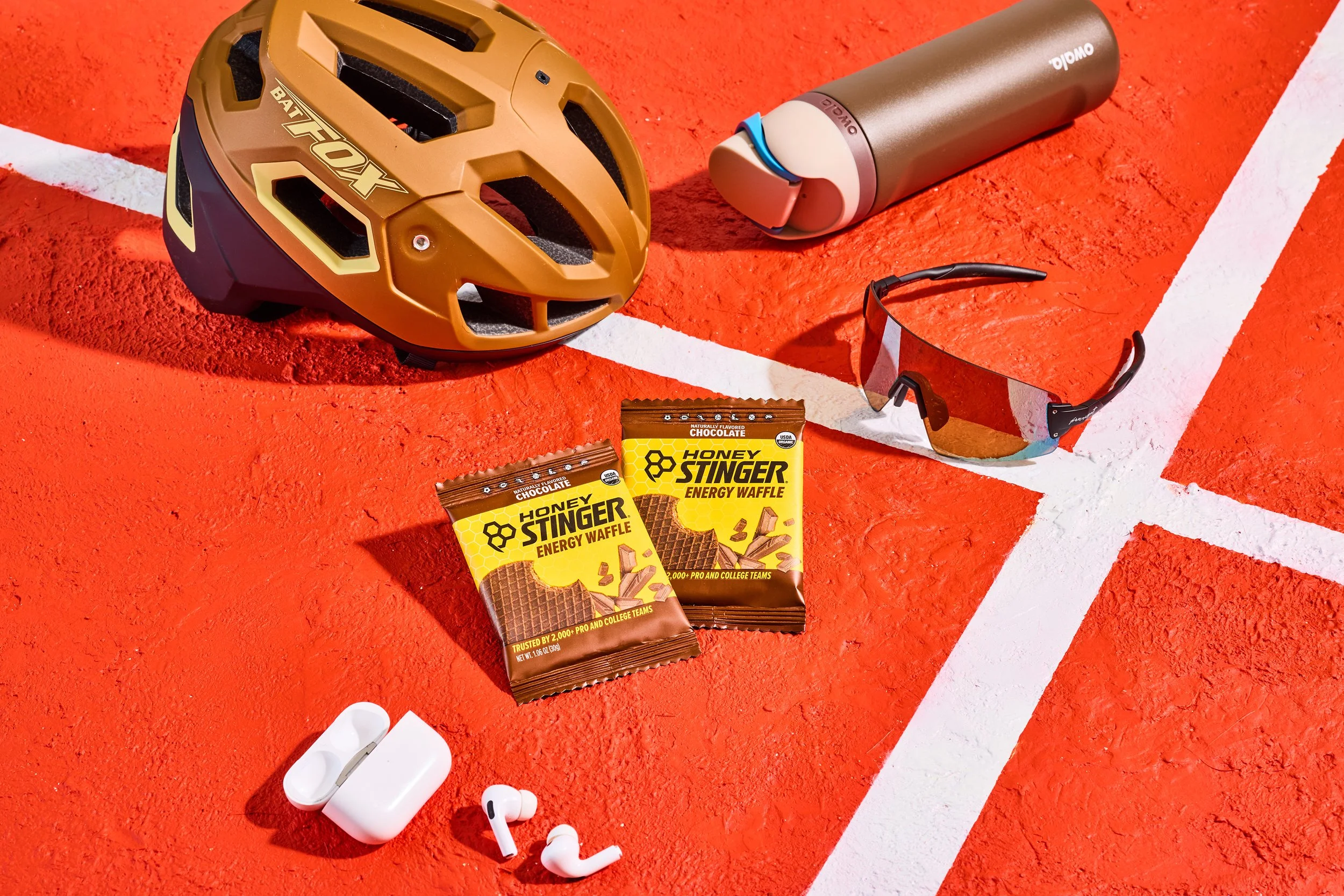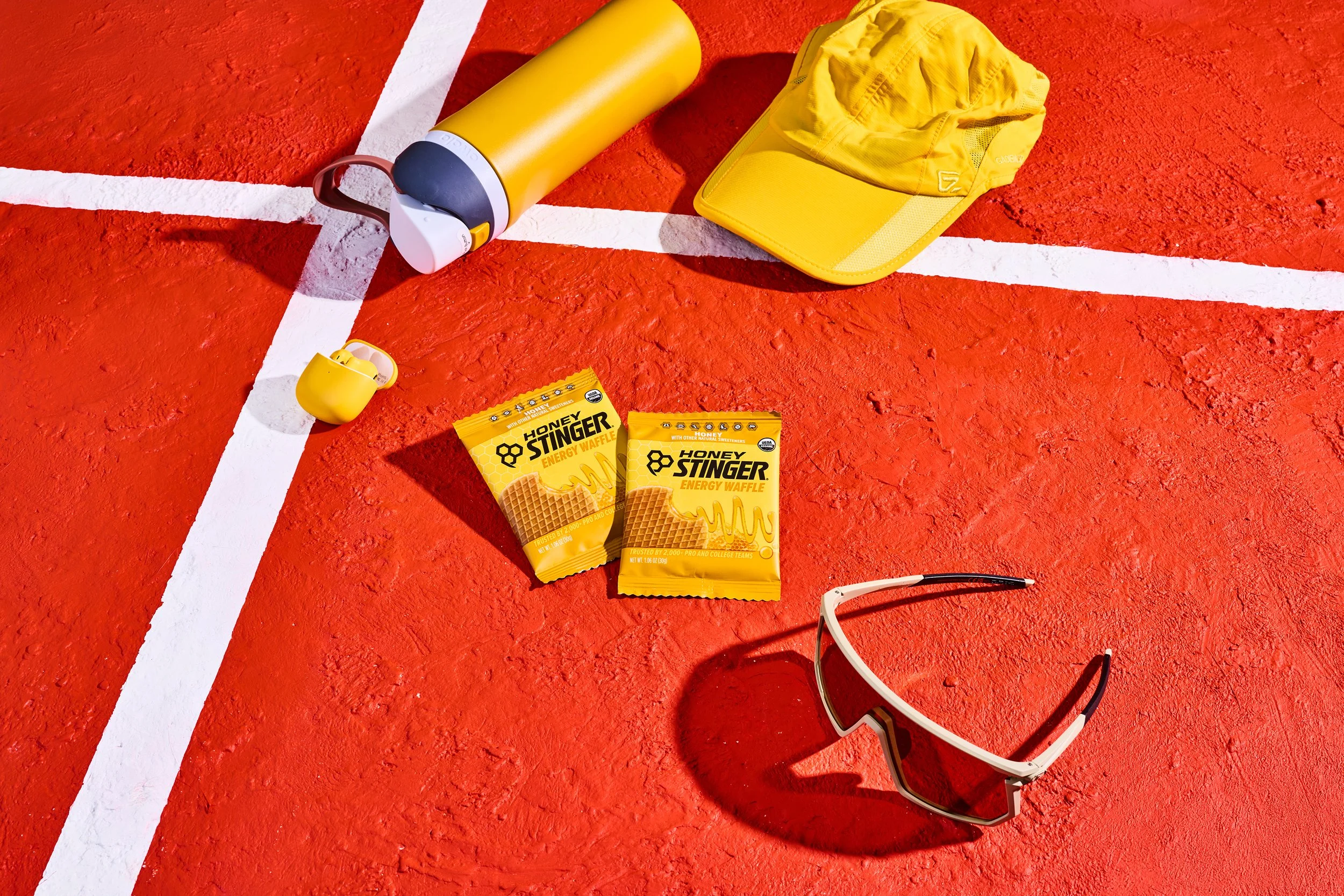Over 2 days with Honey Stinger, we aimed to cover as much ground as possible and place their products purposefully into a variety of new scenes and settings. We built out mood boards, created new backdrops, sourced sports equipment, and pulled inspiration from the color palettes present on their packaging, from their classic waffles to their gels and energy chews.